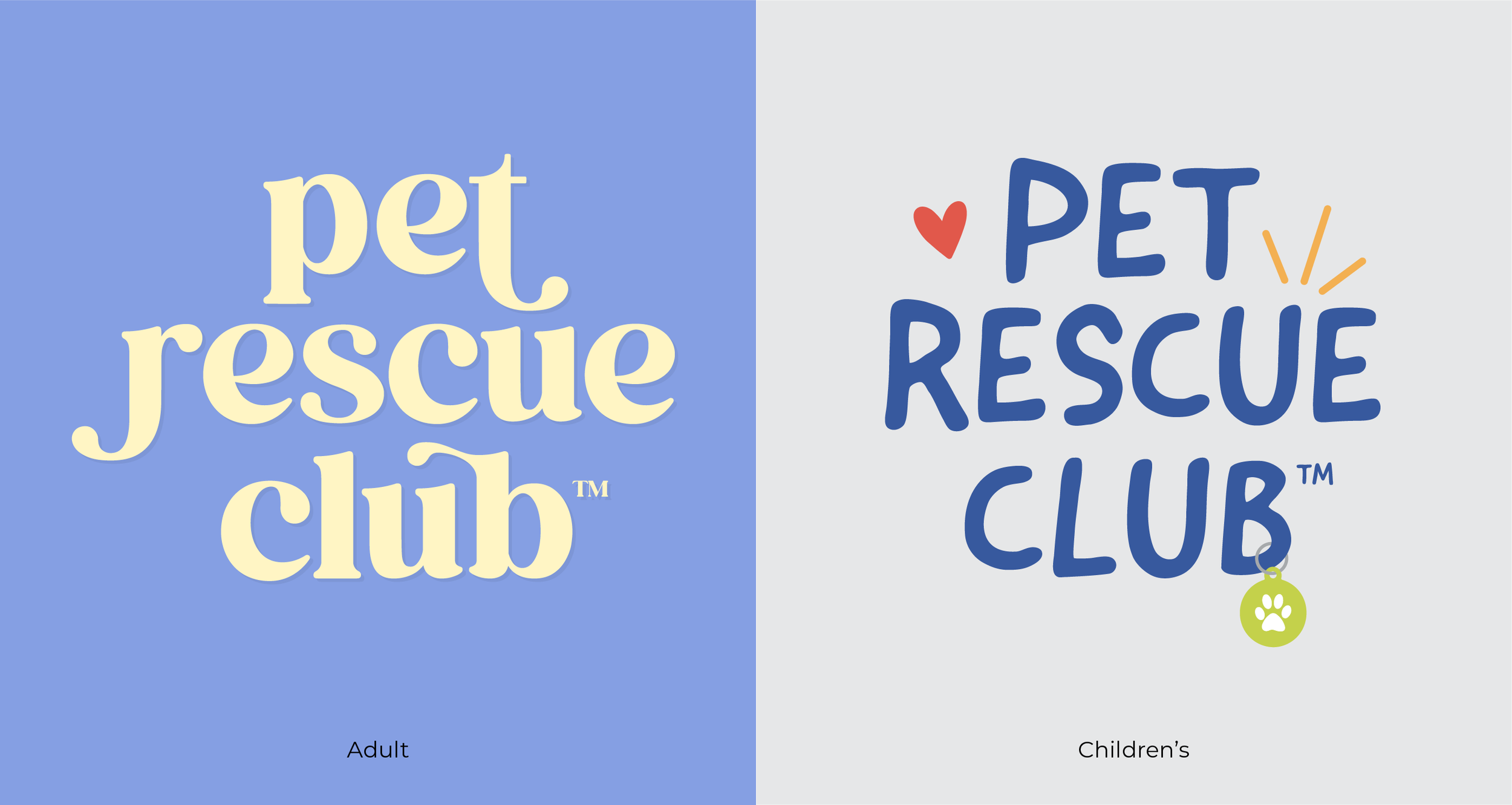Designed two versions of the Pet Rescue Club identity: an adult lockup with custom typography built to feel approachable and modern, and a children's version with a more playful hand-drawn feel, ensuring the collection appeals to all ages of pet rescuers.